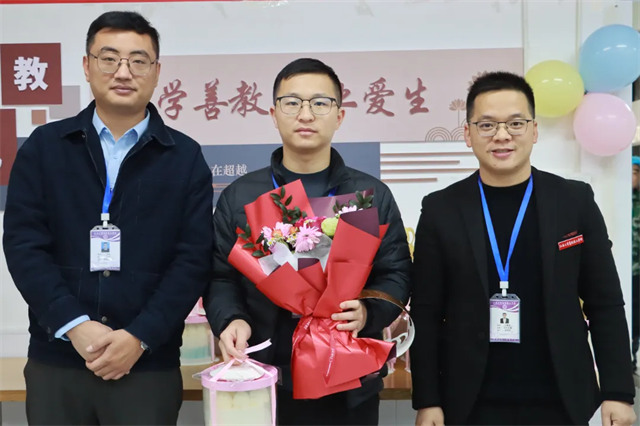 节目表演结束后,迎来了温馨感人的送蛋糕和鲜花环节。学校领导们手捧精心定制的生日蛋糕和娇艳欲滴的鲜花,向本季度过生日的教职工们,为他们送上最诚挚的生日祝福。每一位寿星脸上都洋溢着幸福的笑容,接过蛋糕与鲜花的那一刻,眼中满是感动与惊喜,现场弥漫着浓浓的温情与敬意。