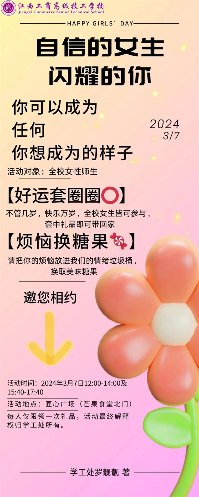 “快乐套圈圈”:不管几岁、快乐万岁,全校女性均可参与。3月7日12:00-14:00在匠心广场开展活动,凡到场女性参与活动均可获得套圈机会一次,套中了礼物就可以带回家,没有套中的女生也可获得玫瑰花一支。